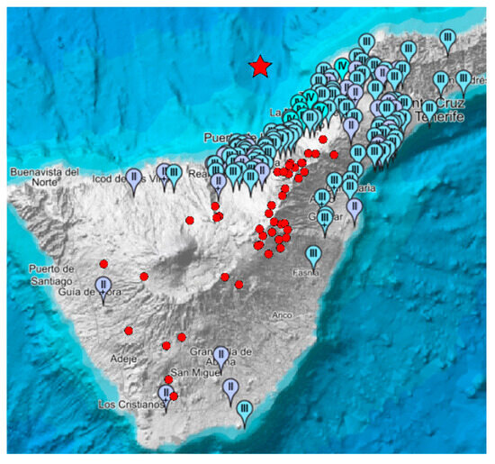 Map of European Macroseismic Scale and location of groundwater tunnels. Distribution of groundwater tunnels (red dots ) studied on the island of Tenerife, Canary Islands, Spain on the map of the European Macroseismic Scale (Table A8), provided by the Spanish National Geographic Institute (IGN) on 18 August 2012, with a seism with a magnitude of 3.8 mbLg. The star is where the epicenter of the seism was located.