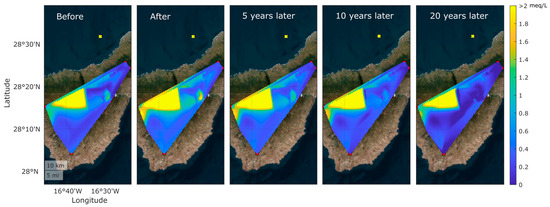Using the above equation, the concentration of F− in the water of each tunnel can be estimated over a future horizon (e.g., 1 year or 20 years) (Table 5). Taking into account the entirety of the studied water collection points, a prediction can be formulated with a spatiotemporal representation (Figure 10). As depicted in Figure 10, the estimated spatiotemporal variation in fluoride concentration is presented for different periods: before the earthquake, following it, and at 5, 10, and 20 years thereafter.