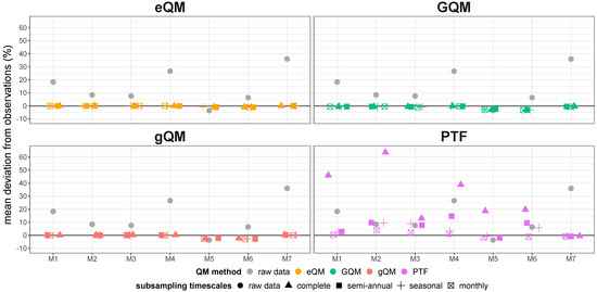 The uncorrected RCM simulations showed considerable deviations from the observations, as Figure 2 shows exemplary for the mean annual precipitation sum. Six out of the seven uncorrected RCM simulations overestimated the mean annual precipitation sum between approximately 5% and up to 35%. One RCM simulation (M5) underestimated it by approximately 5%. The majority of the applied BCs resulted in very good corrections of this characteristic. Only the QM method PTF failed in several cases to correct the bias for the coarser subsampling timescales (especially complete, but also semi-annual), even increasing it to deviations of up to 65% in one case. The QM method eQM resulted in the best corrections based on this characteristic.
