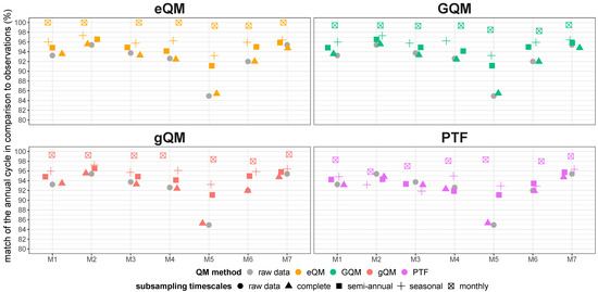 All QM methods were predominantly able to correct for errors in the annual cycle when applied with subsampling. The correction was again best for the QM method eQM. The results also clearly showed that the finer the subsampling timescale, the better the correction of the annual cycle.