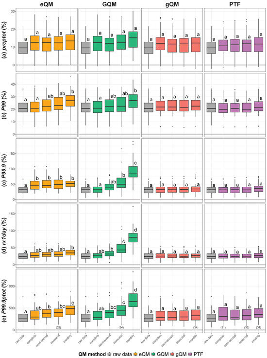 rsm values of the CCSs for the period 2071 to 2100 compared to the base period 1971 to 2000 for indices (a) prcptot, (b) , (c) , (d) rx1day and (e) ptot depending on the QM method used. Significant differences ( = 0.05) are indicated by the letters. Each boxplot is based on 35 rsm values (7 climate projections × 5 20% samples) unless otherwise noted below the respective boxplot. Lower numbers for some boxplots are due to infinite values at single grid cells.