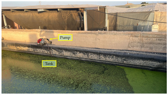 The water tank, depicted in Figure 4, is an open storage basin that serves as the primary water reservoir. This tank, positioned near the greenhouse, ensures a consistent supply of water for both irrigation and energy generation. The water pump, also visible in Figure 4, is installed adjacent to the tank. This pump draws water from the tank and increases its pressure to the required level. The pump is connected via pipelines to the rest of the system inside the greenhouse. The drive system of the pump consists of a two-stroke engine with a displacement of 52 cc, capable of developing a power of 1450 W. The pump offers a flow rate up to 12 m3/h with a power of 24 m of water column and a suction capacity of 7 m.