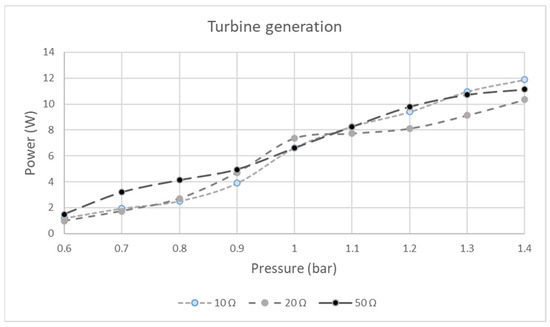 Figure 9 illustrates the relationship between pressure and power output for the turbine under various electric loads (10 Ω, 20 Ω, and 50 Ω). The graph demonstrates that, as the pressure increases, the power output also increases for all loads. Notably, the turbine achieves nearly 12 W of power at the maximum installation pressure of approximately 1.4 bar. This is the maximum pressure from the pump for this particular plantation. For higher pressures, progressively greater power results would be obtained.