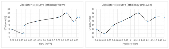 Characteristic curves of efficiency with respect to flow rate and pressure under the conditions analyzed.