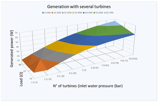 In Figure 11, the graph represents the generated power at different electric loads and varying pressures, with each pressure value corresponding to the number of turbines installed in series. As the number of turbines increases, the pressure decreases, impacting the power generation capabilities of the system. Note that the legend in Figure 11 refers to the value of power generated in W. Likewise, on the axis of the number of turbines, the corresponding pressure in bar is indicated in parentheses, given that, as the number of turbines in series progressively increases, the total output pressure decreases.