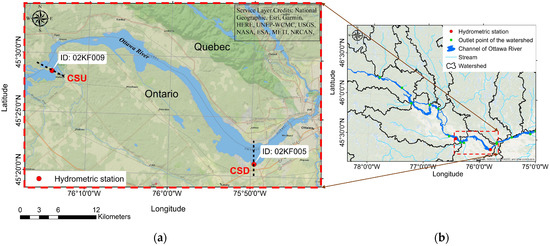 Figure 1. (a) Close-up view of the Ottawa River between hydrometric stations 02KF009 (CS upstream or CSU) and 02KF005 (CS downstream or CSD); (b) broad view of the stream network, watershed boundaries, and outlet points, illustrating how these watersheds flow into and connect with the Ottawa River.