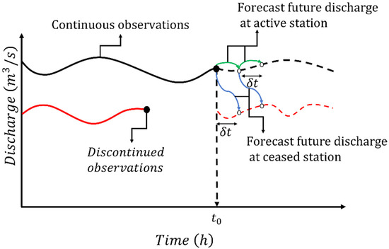 Floods occur when river discharge, q, exceeds a certain bankfull threshold. Thus, it is crucial to be able to predict discharge in real-time for the coming hours to provide early warning of floods, plan evacuation activities and structural measures, and prepare for flood hazards [11,12]. In order to improve the predictions about how q will change over the coming hours, the current initial value of q should be known, e.g., from real-time observations (Figure 1). However, in reality, continuous real-time observations from the river cross-section (CS) of interest may not be available, as schematically illustrated in Figure 2.