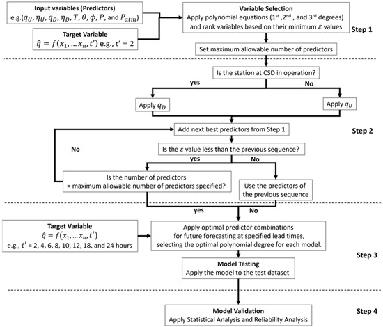 The question remains as to whether further adding θ or P (ranked 5th and 6th, respectively; see Table 1) or both to the dual predictors ( q U and η U ) will result in even better accuracy. In order to answer this question, Step 2 of the methods (Figure 4) continued as follows: MGMDH progressively included η U and P, in addition to q U , as predictors. The resulting 1st degree polynomial function showed a slight reduction in ε with the addition of P, but no reduction with the further addition of θ . Thus, the 1st degree polynomial function with the triple predictors ( q U , η U and P) was, as expected, the optimal model for discharge forecasting. For δ t = 2 h, the optimal polynomial function for discharge forecasting is