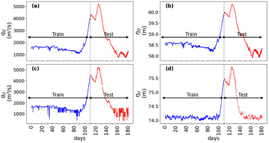Figure 5. Time series of hourly averaged variable: (a) discharge q D ; (b) water level η D , observed from the CS of interest (02KF005); (c) discharge q U ; (d) water level η U , observed from 02KF009, covering a period of 180 days (1 January–30 June 2023). The dotted lines divide the time series into two parts: one for model training, and the other for model testing (the same in subsequent figures).