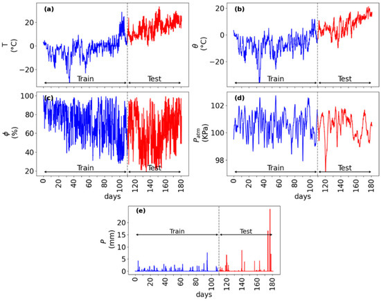 Figure 6. Time series of observed hourly averaged variable: (a) T ; (b) θ ; (c) ϕ ; (d) P a t m ; (e) P for the period of 1 January–30 June 2023 at WMO station (ID: 71063) located at 45°23′00″ N, 75°43′00″ W.