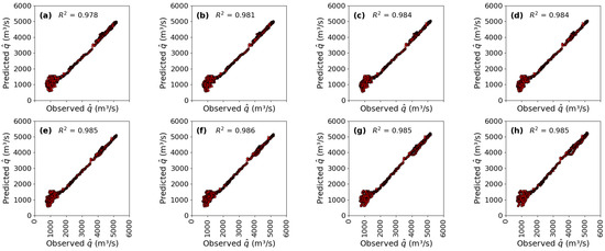 The magnitudes of q D differed significantly between the training dataset and the testing dataset. The former ranged from 704 to 5170 m3/s, with a standard deviation of 488 m3/s, whereas the latter varied from 1050 to 4120 m3/s, with a standard deviation of 1457 m3/s. It is a great challenge for an artificial intelligence model to capture the large variations in discharge present inf the testing dataset. Such varied discharge conditions serve the purpose of testing the model’s adaptability well.