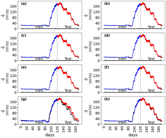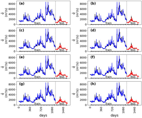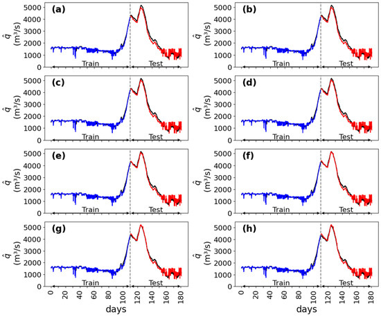 Figure 13. Time series of hourly averaged discharges, observed at CSD of the Missouri River (black curve), and forecasted for the training period (blue curve) and for the testing period (red curve). The forecast is for lead times: (a) δ t = 2; (b) 4; (c) 6; (d) 8; (e) 10; (f) 12; (g) 18; and (h) 24 h.