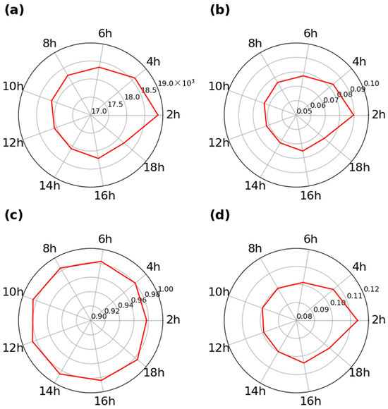 Take as an example a single data entry of discharge on 11 May 2023, at 6:00:00 AM. For δ t = 2 h, the observed discharge was 4310 m3/s, while the predicted discharge using Equation (14) was 4080 m3/s, resulting in a relative error ε a of 5%. In contrast, for δ t = 12 h, the observed discharge was 4240 m3/s, and the predicted discharge was 4206 m3/s (forecast equation is not listed), yielding a significantly lower relative error of 0.8%. This example shows improved forecast accuracy when the lead time is closer to the advection time. This alignment with the physical process likely improves the model’s R2 value, as the model’s predictive accuracy is more consistent when the forecast interval corresponds to the actual travel time of water between cross-sections. Therefore, choosing time intervals that reflect the natural advection time can significantly influence the overall performance and reliability of the model.