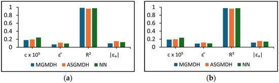 In Figure 12, the performance of the MGMDH (applied to Ottawa River data for best and worst leading times δ t = 12 h (Figure 12a) and δ t = 2 h (Figure 12b), respectively) is compared to other two MLMs: adaptive structure of the group method of data handling (ASGMDH) and neural network (NN) that had five hidden layers and eight neurons. Figure 12 covered the complete list of statistical indicators given in Equations (3)–(6). The MGMDH slightly outperforms ASGMDH and NN in terms of c and R 2 and more significantly in terms of ε ~ and ε a . For more details about these four indicators for the ASGMDH, refer to Letessier et al. (2023) [30]. This can reflect that MGMDH has the capability to handle data with a wide variety of patterns, whereas ASGMDH can handle a limited variety of patterns. A plausible reason that MGMDH outperforms NN is NN’s tendency to overfit, especially with small or noisy datasets, and its complex structure that requires extensive tuning and may not always effectively capture underlying data patterns.