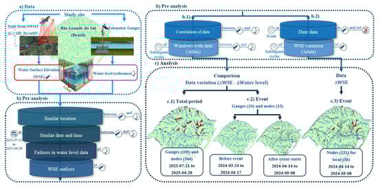Figure 1 outlines the methodological workflow, which is structured in three sequential stages: (i) data acquisition, (ii) data pre-processing, (iii) filtering and comparative analysis between SWOT WSE and telemetric gauge data. Initially (Figure 1a), water surface elevation data were acquired from the SWOT product L2_HR_RiverSP, focusing on nodes, which are points distributed every ~200 m along the river’s centerline. Additionally, in situ water-level data from telemetry gauges located in the rivers of Rio Grande do Sul were obtained for the same period covered by SWOT observations (Figure 1a). The objective was to compare the WSE measurements provided by the nodes with data from multiple nearby telemetric gauges (used as a water-level reference).