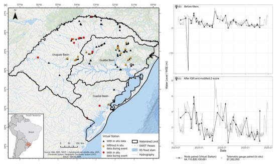(a) Map of the 100 locations with nodes and telemetric gauges studied in Rio Grande do Sul, Brazil. Example of water-level time series and WSE time series (b) before and (c) after outliers’ filters.