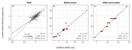 After the start of the event (Figure 4c), it is noteworthy that increases in water variation were observed in the field at all locations studied, as expected since 478 of the 497 municipalities were affected by the extreme event. As observed in Figure 3b,c, there is a greater difference between the two datasets, leading to a worsening in the MAE, at 26 cm, and in the RMSE, at 34 cm, with an R2 of 0.96 (Figure 4c). However, even with this increase in error, the results still demonstrate a good overall accuracy for the relationship between the variations of SWOT WSE observations and in situ water-level data.