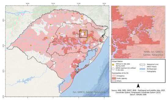 In scenarios of extreme events, there is an urgent need to implement preventive actions with the population, improve weather forecasting and disaster risk warning systems, develop innovative and accessible flood assessment tools, and implement urban planning strategies that promote more sustainable forms and structures [,]. The 2024 floods caused damage to, and in some cases, the loss of, many in situ hydrological monitoring gauges in RS due to river currents and flooding, resulting in gaps and failures in data acquisition. These failures significantly impaired real-time monitoring and hindered timely emergency response and alert issuance [,].