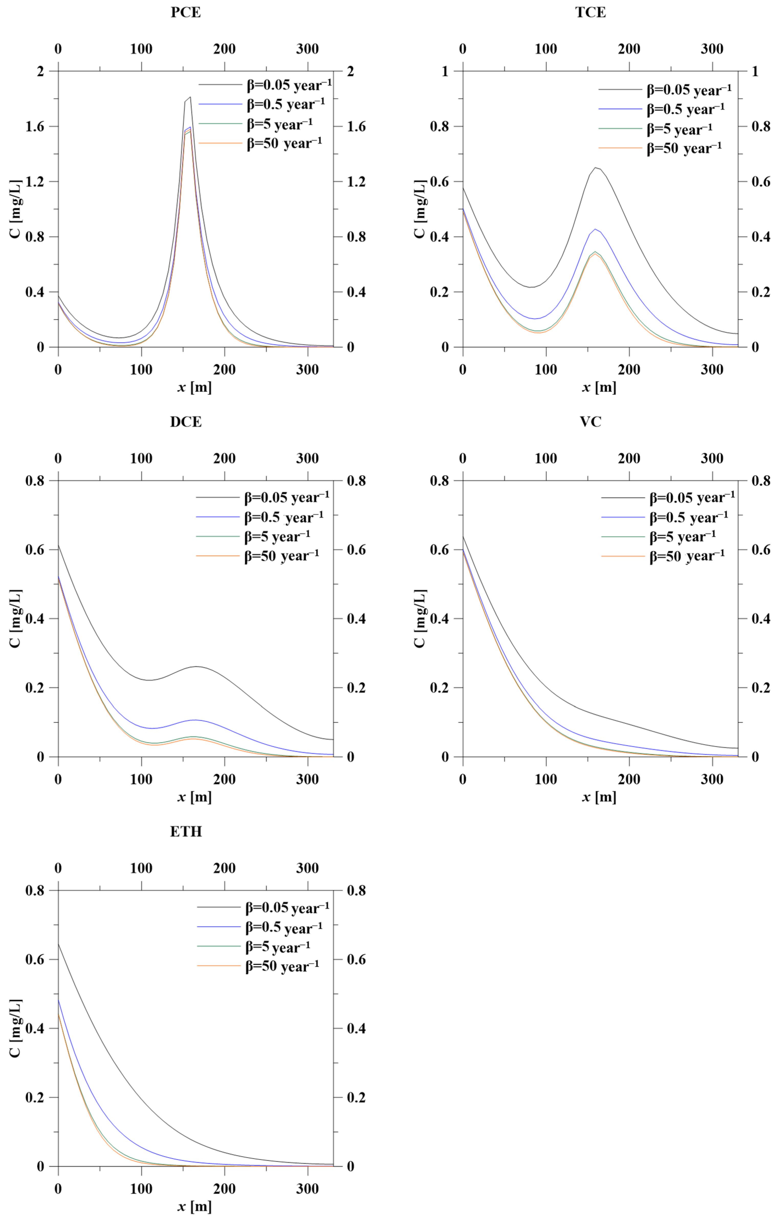 - Clement, T.P. Generalized solution to multispecies transport equations coupled with a first-order reaction network. Water Resour. Res. 2001, 37, 157–163. [Google Scholar] [CrossRef]
