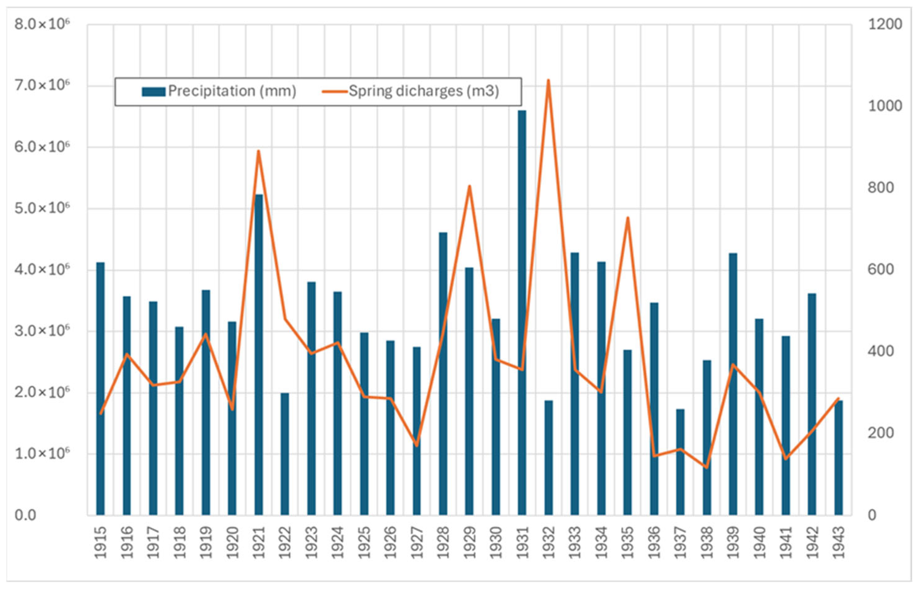 - Training set (1928–1944, ~80%): The most recent period, encompassing significant events including drought episodes and the construction of galleries in 1928 and 1944, was reserved for training the neural networks. This period was selected deliberately to capture the aquifer’s hydrodynamic responses under specific varying stresses.