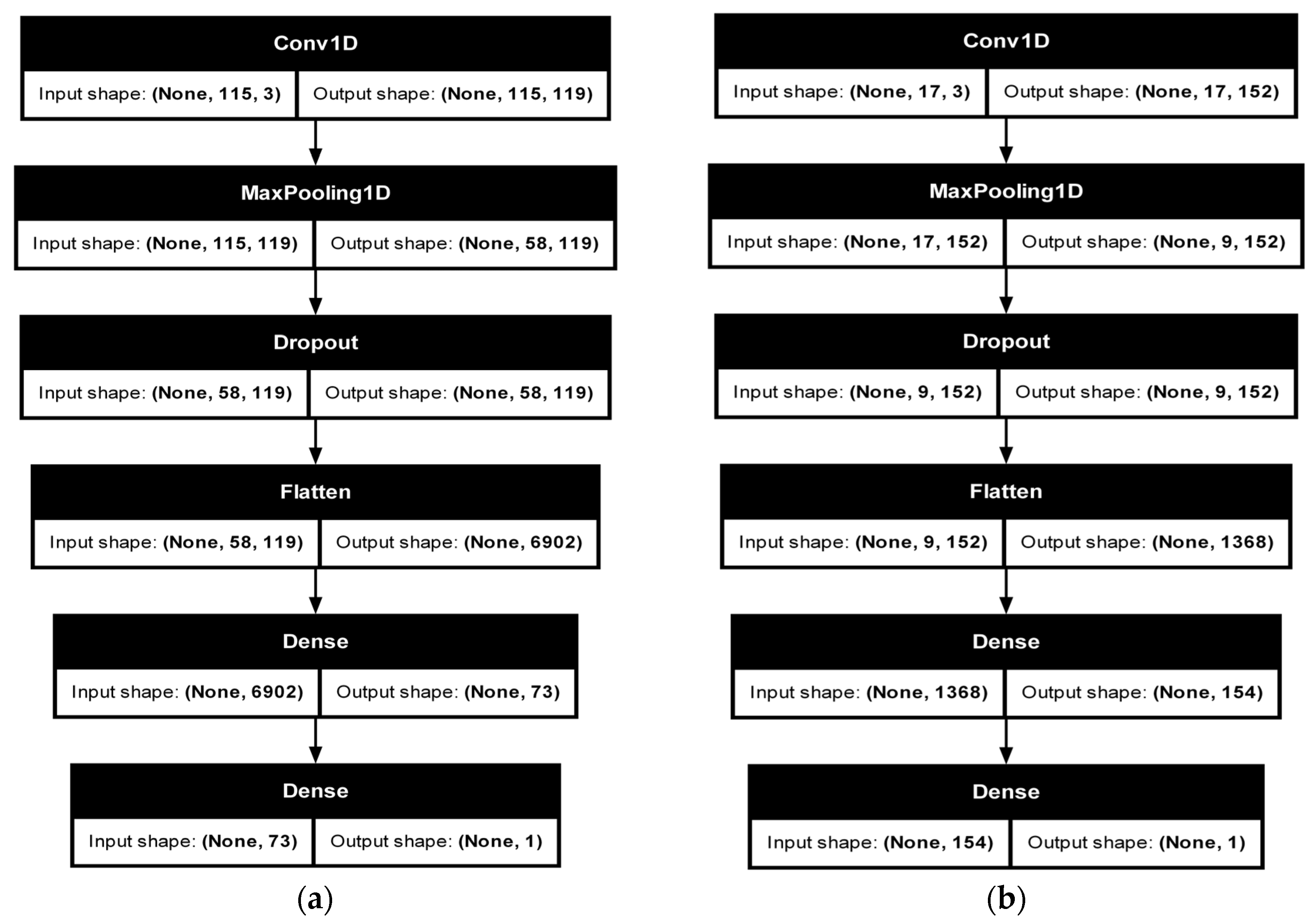- CNN model for weekly forecasting follows a similar but adjusted structure, starting with a Conv1D layer featuring 152 filters (kernel size of 3). A subsequent MaxPooling1D layer reduces feature size, followed by dropout. The flattened output is then processed through a dense layer containing 154 neurons with ReLU activation. Lastly, a dense output layer with a single neuron provides the predicted weekly discharge (Figure 12).