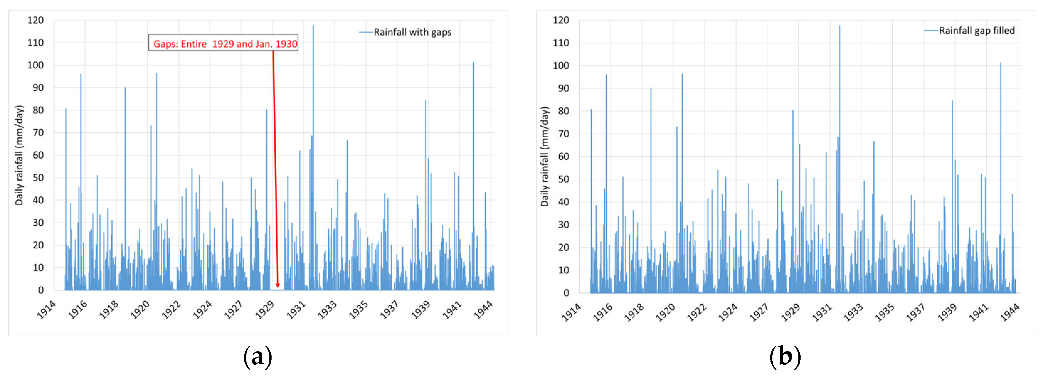 Rainfall | 1915 to 1944 | 1929 to January 1930 | Linear Interpolation | Historical data (Data from National Archive: http://www.bnt.nat.tn:81/numerisation/khaldounia/periodiques/fr/E-Per-2850/E-Per-2850.htm, accessed on 19 January 2020) |