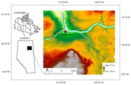 The Athabasca River, the largest undammed river in Alberta, spans 1231 km from its source in the Canadian Rockies to its terminus at Lake Athabasca. Fort McMurray, situated along the river’s lower reaches, is the largest settlement in this region, with a population of 66,573 as of 2016. At Fort McMurray, the Athabasca River’s mean annual discharge is 20,860 km3 []. The river’s water is primarily withdrawn for agricultural and industrial purposes, with increasing withdrawals over time raising environmental and social concerns regarding the sustainability of the LAR []. Figure 1 shows the study area, including the municipality of Fort McMurray.