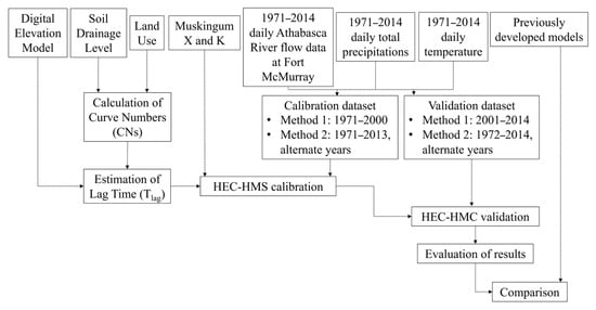 Time series data for daily flow, total daily precipitations, and daily temperature spanning from 1971 to 2014 was used in this study. Two techniques were applied to partition for model calibration and validation. The first technique, referred to as “Method 1”, divided the 1971–2014 dataset based on temporal dependency. Specifically, data from 1 January 1971 to 31 December 2000, was used for model calibration, while data from 1 January 2001, to 31 December 2014, was reserved for model validation. The second technique, “Method 2”, followed a temporally independent approach, where alternate years were allocated for model calibration (i.e., 1971, 1973, 1975, …, 2013) and validation (i.e., 1972, 1974, 1976, …, 2014). These two approaches were selected in alignment with Belvederesi et al. [,] to assess the impact of temporally dependent versus independent data on model accuracy. A schematic diagram of the developed model is presented in Figure 2. This methodology was consistently applied to both the temporally dependent (Method 1) and independent (Method 2) approaches.