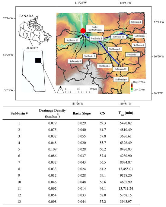 The drainage density ranged from 0.012 km/km2 in Subbasin 9 to 0.109 km/km2 in Subbasin 5, indicating that Subbasin 5 is nearly 10 times more dendritic than Subbasin 9. The average basin slope was 3.4%, with values ranging from 1.4% in Subbasin 11 to 5.5% in Subbasin 3. As expected, lower slopes were associated with longer lag times, as the distance for precipitated water to travel to the subbasin outlet increased. For example, Subbasin 3, with the steepest slope, also had the shortest lag time (i.e., 3686 min), as water traveled faster due to increased slope. Conversely, Subbasin 11, with the lowest slope, had the longest lag time (i.e., 13,711.24 min). Subbasin 11 also showed the lowest CN, equal to 46.1. Notably, about 25% of the land Subbasin 11 was categorized as “water” or “wetland”. In contrast, Subbasin 2 had the highest CN, equal to 61.7, and was primarily forested, with approximately 70% of the area covered by “temperate or sub-polar needleleaf forest” and about 23% by “temperate or sub-polar shrubland”. The “temperate or sub-polar shrubland” cover type in Subbasin 2 was the largest among all subbasins, which might have contributed to its high CN. This could be explained by the fact that small or short vegetation typical of shrublands had lower canopy interception and retention compared to needleleaf forests []. Subbasin 2 was particularly critical due to its short lag time, high CN, and steep slope, which together resulted in a larger runoff contribution during significant rainfall events, and snowmelt, especially with increasing temperatures.