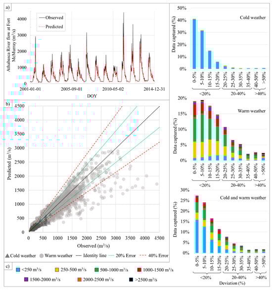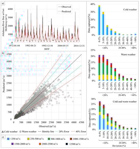 To further analyze the model outcomes and better understand the frequency of error deviations, additional analyses were conducted. Figure 4 and Figure 5 provide graphical summary of the results for Method 1 and Method 2, including: (a) time series of the observed and forecasted daily Athabasca River flow at Fort McMurray, (b) scatter plots comparing the observed against the forecasted Athabasca River flow at Fort McMurray, with 20% and 40% margin of error lines, and (c) bar charts displaying the distribution of data within each error deviation group (0–5%, 5–10%, 10–15%, …, above 50%) for the cold weather, warm weather, and entire-year applications.