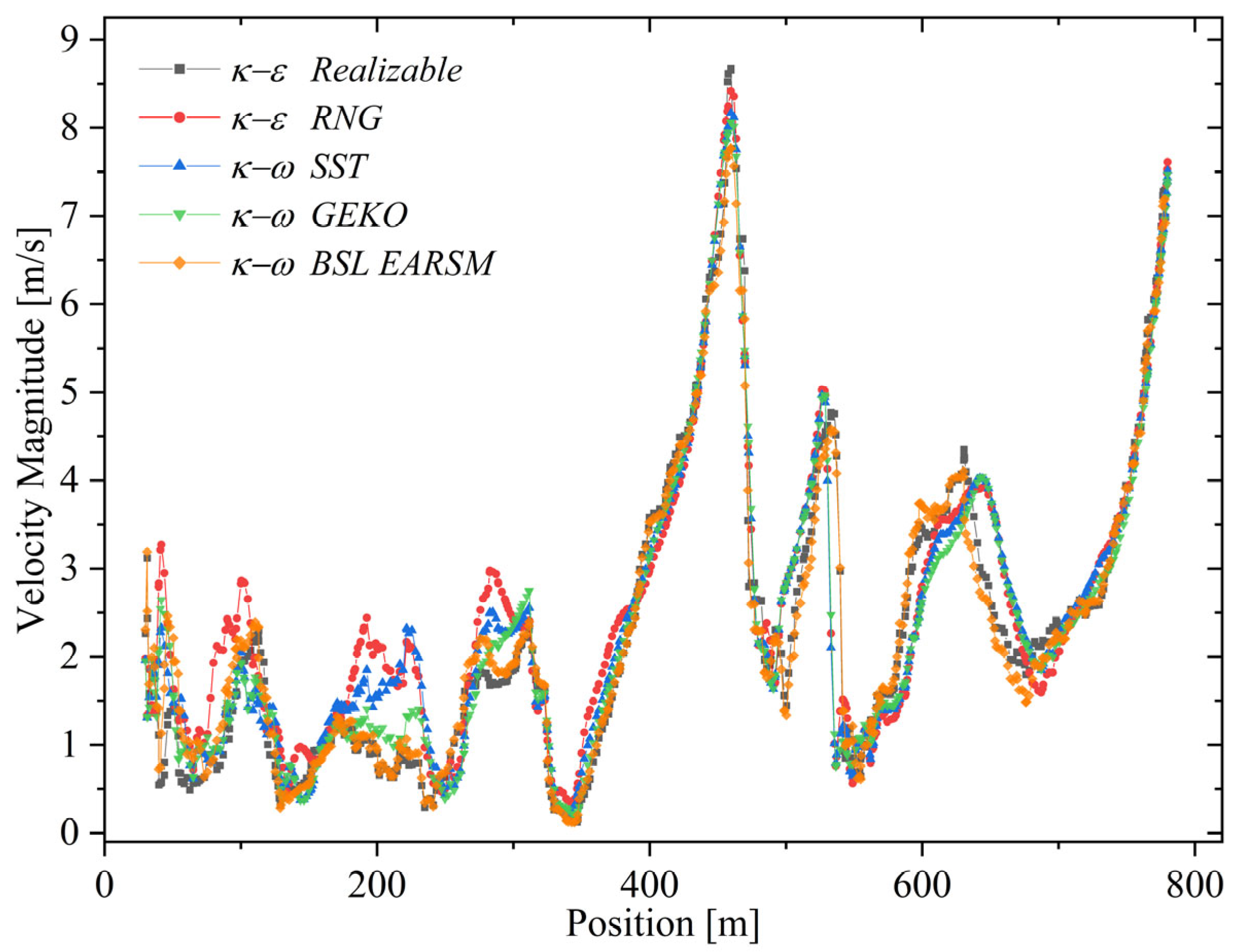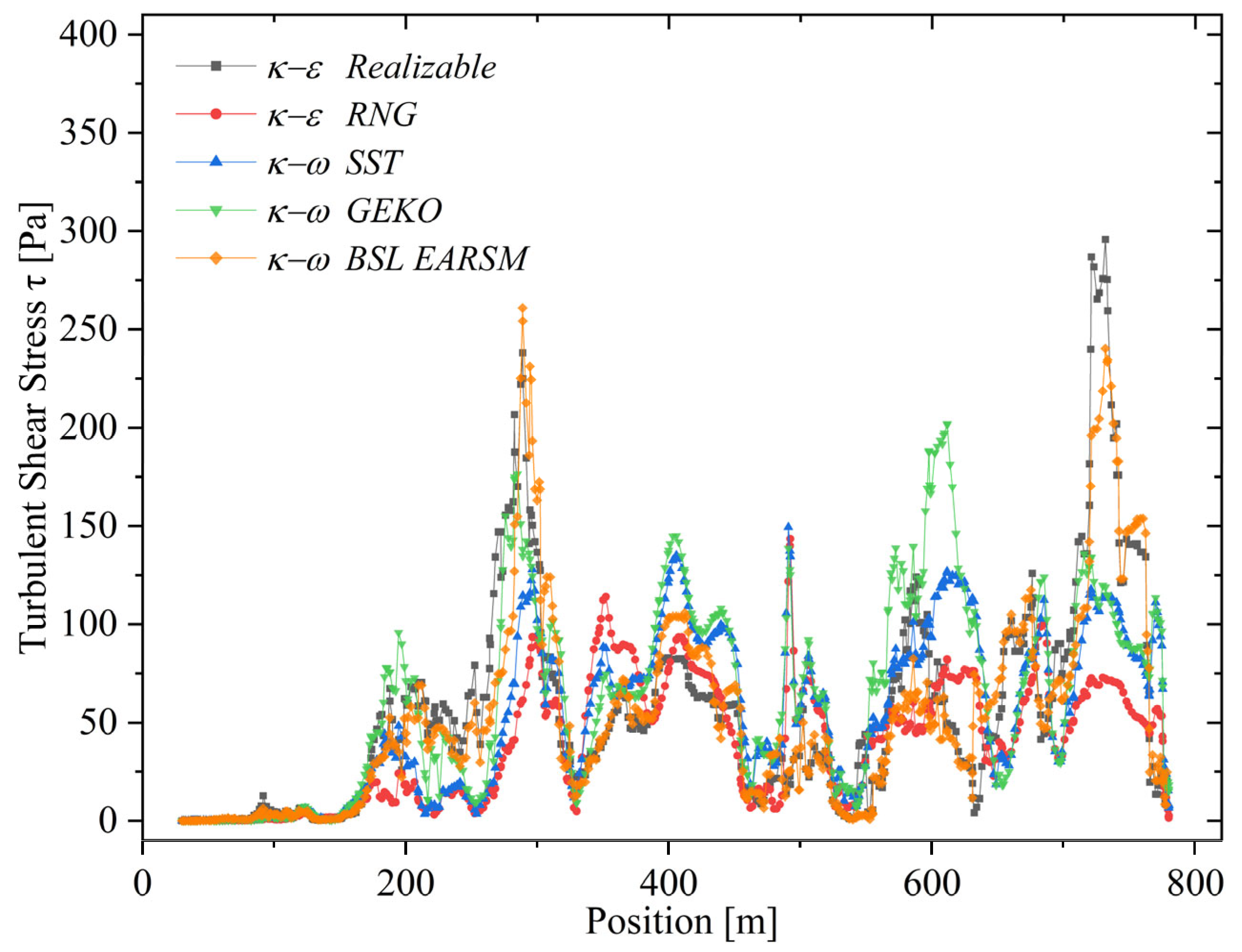Figure 12. Distribution of turbulent shear stress ( τ t ) predicted by each turbulence model along the flow domain. The graph compares the magnitude and variability of τ , revealing differences in sensitivity to local velocity gradients and turbulence intensity.