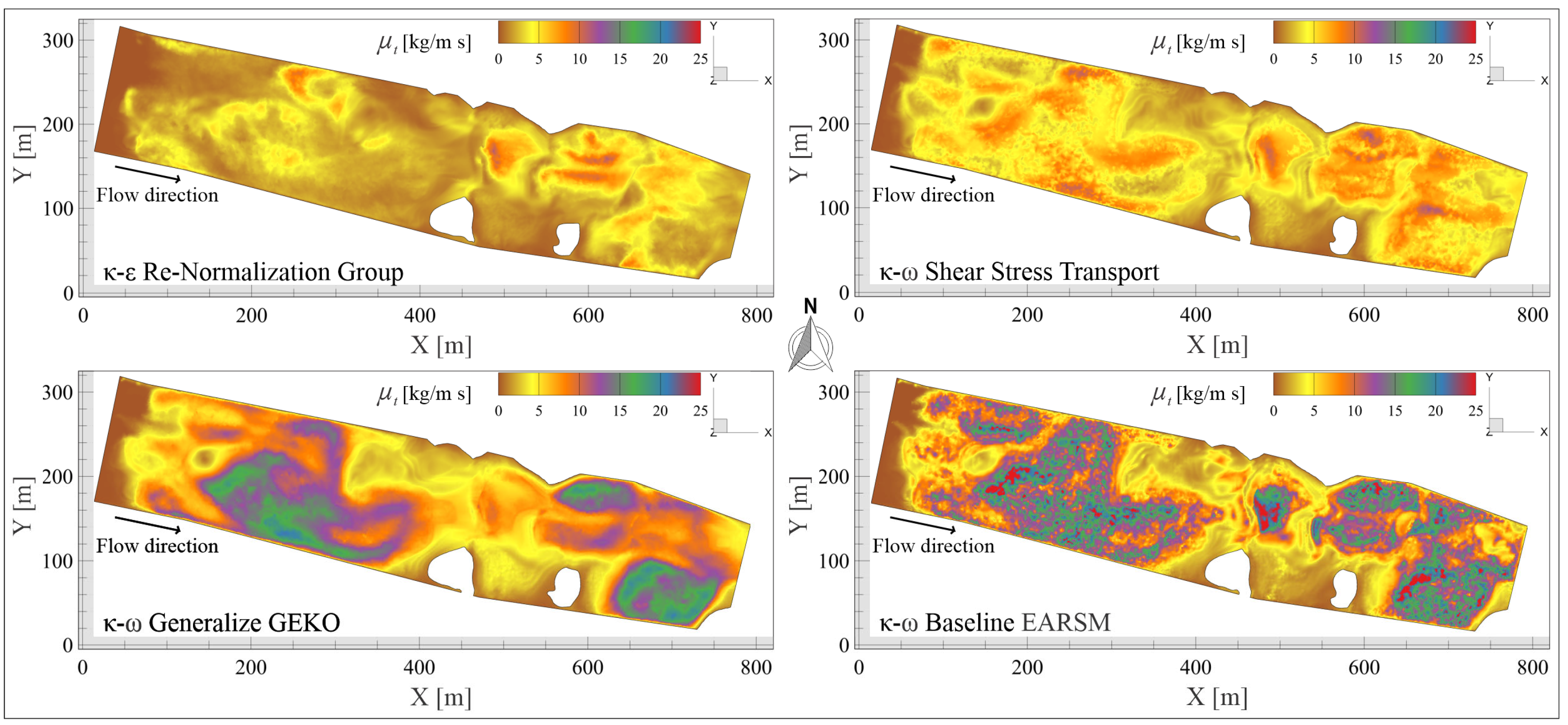 Although fluid viscosity ( μ ) depends on molecular properties, temperature, and pressure, river water’s dynamic viscosity remains relatively constant. However, it may be altered by suspended sediments and entrained materials resulting from the river’s own motion and morphology. Sediment transport is excluded to isolate each turbulence model’s intrinsic performance. It is important to note that μ t are distributed over an iso-surface to illustrate development across the computational domain; minimum, maximum, and average values do not capture the full spatial distribution, representing only a portion of the overall field. This ensures correct interpretation of the model predictions without misleading assumptions about the flow.