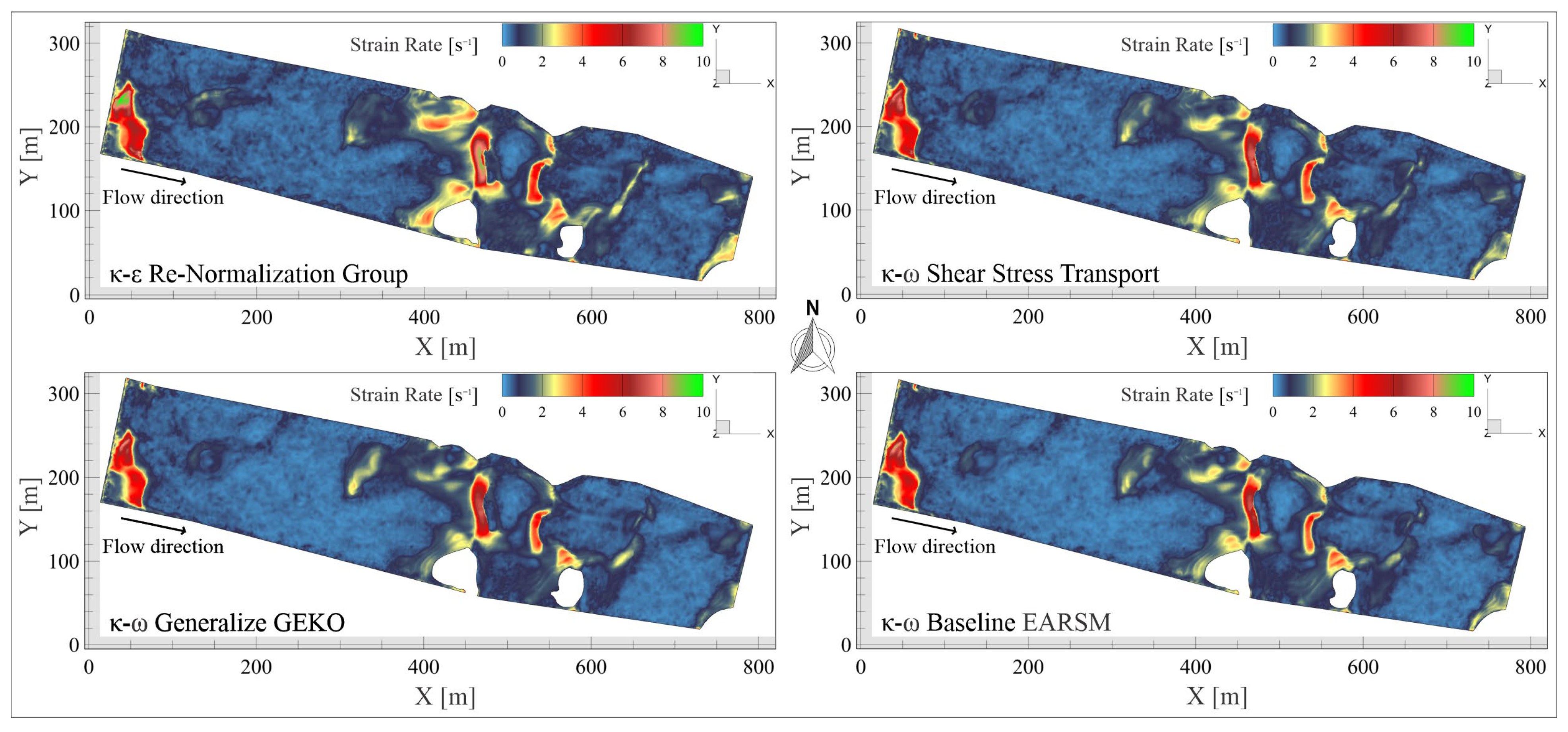 Figure 7. Contours of strain rate on the iso-surface representing the river’s free surface of volume fraction α = 0.99, comparing predictions from different turbulence models. The visualization highlights spatial variations in flow deformation intensity, with notable differences in maximum strain rate values reflecting each model’s sensitivity to regions of high shear and turbulence anisotropy.