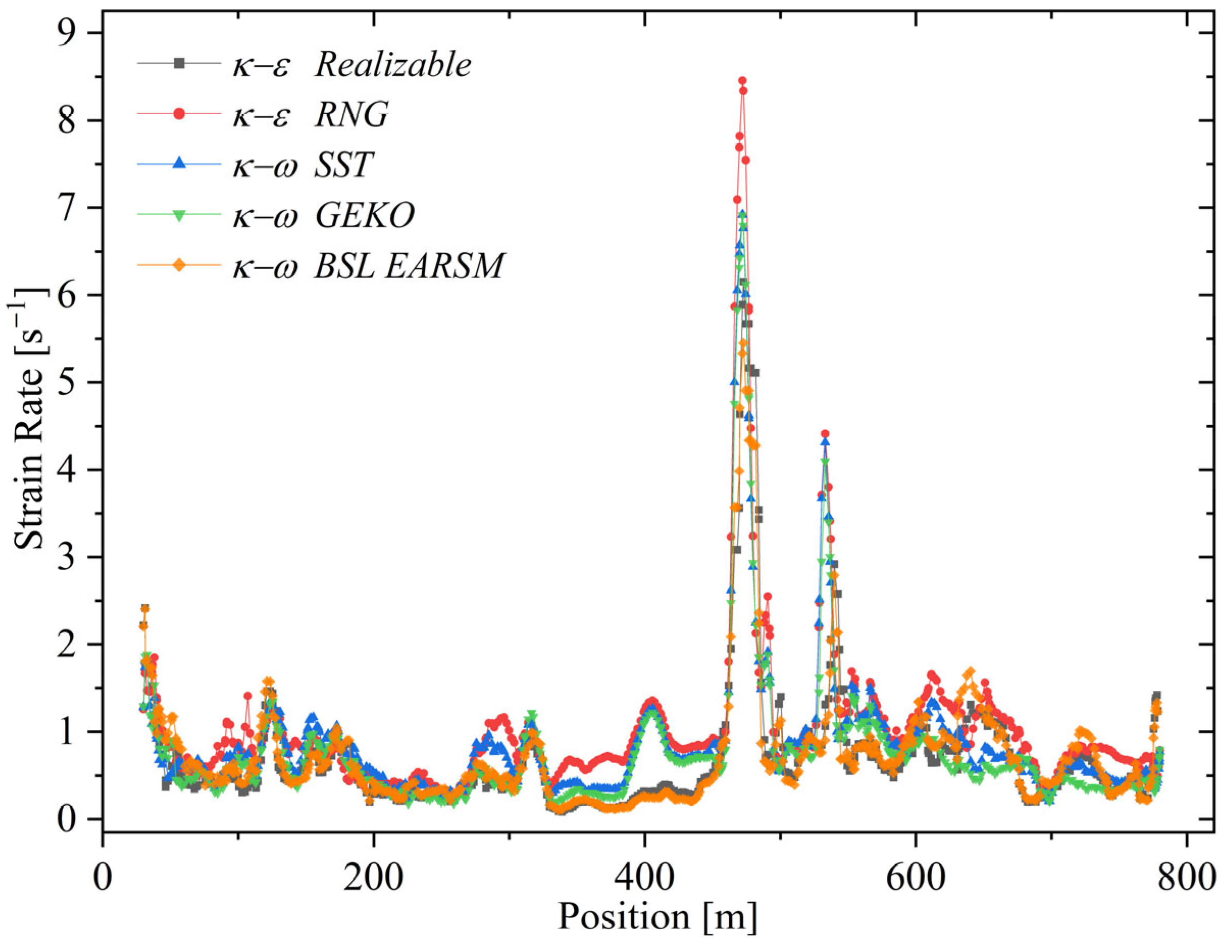 Figure 8. Strain rate distribution along the computational domain predicted by various turbulence models. The graph compares the sensitivity of each model to flow deformation gradients, highlighting differences in maximum and minimum values that reflect their treatment of turbulent stress anisotropy and numerical stability.