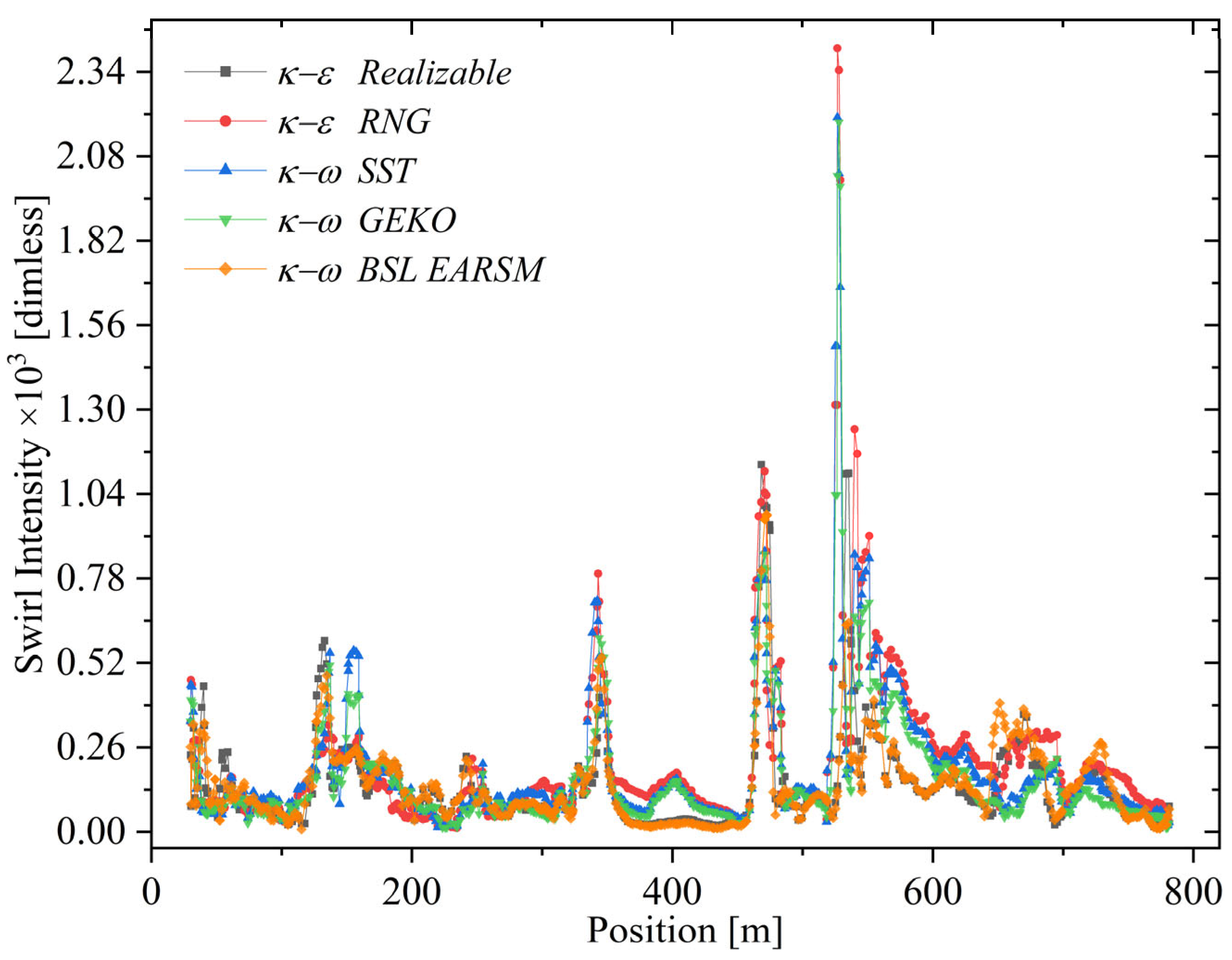 Figure 10. Swirl intensity along the axial direction, as predicted by each turbulence model. The plot shows the onset and amplification of swirl structures, highlighting differences in model sensitivity to local velocity gradients.