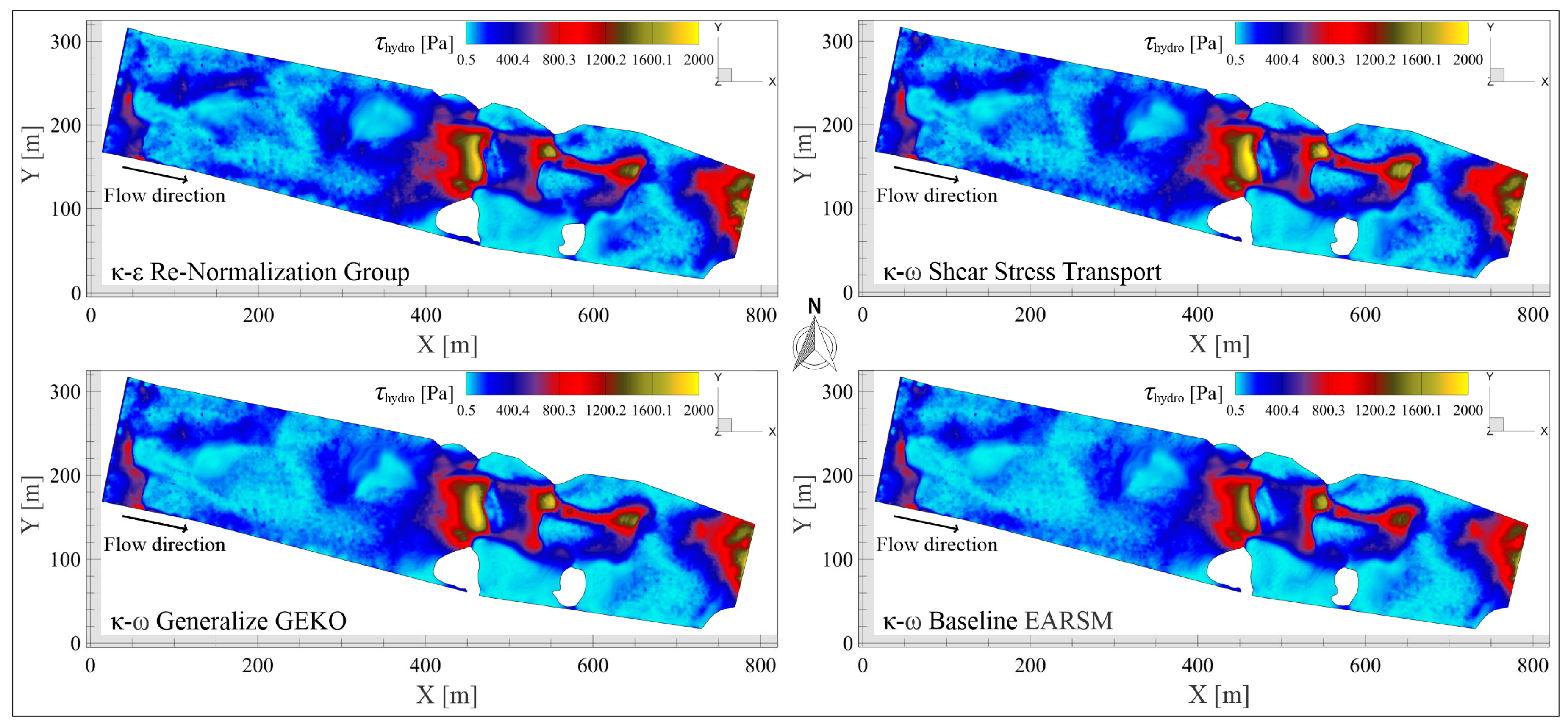 Figure 13. Contours of hydraulic shear stress ( τ h y d r o = ρ u s h 2 ) mapped over the iso-surface of the free surface for the RNG, SST, GEKO, and BSL–EARSM turbulence models. The visualizations depict spatial distribution and relative magnitude.