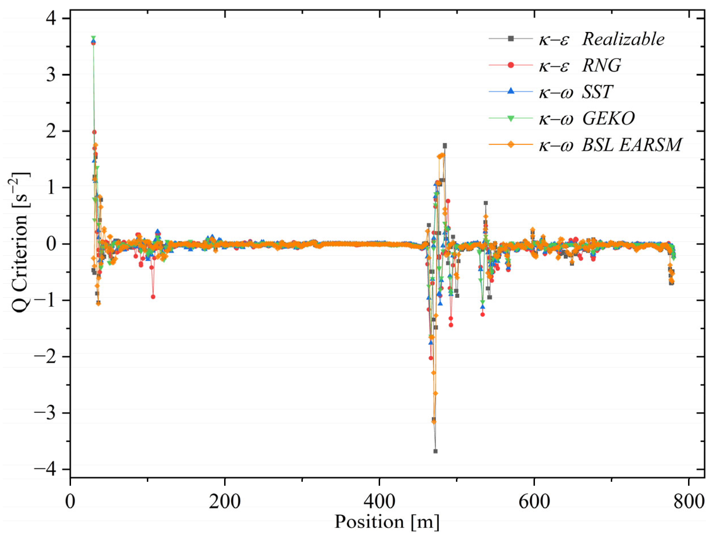 Figure 16. Turbulence models’ maximum and minimum Q-criterion values. SST exhibits the highest maximum vortex intensity, followed closely by GEKO and BSL–EARSM, while RNG shows the lowest maximum and the most negative minimum values. This graph highlights the variation in vortex strength and strain among the models.