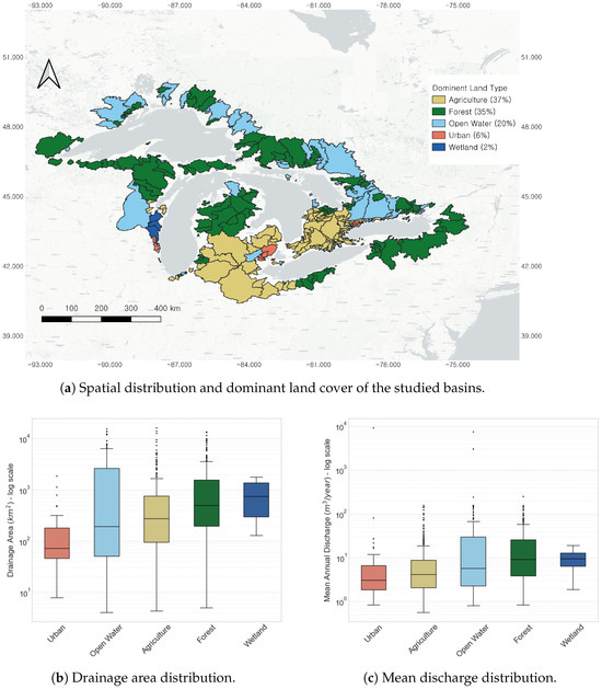 Study domain and key characteristics of the 975 sub-basins in the Laurentian Great Lakes Basin. (a) Spatial distribution and dominant land cover of the studied basins. Colors represent the primary land cover type: forest (35%), agriculture (37%), open water (20%), urban (6%), and wetland (2%). The study domain boundary is indicated by the red dashed line. (b) Box plots showing the distribution of drainage areas (in km2) on a scale, grouped by dominant land cover. The overall median drainage area for all basins is 304 km2, with values ranging from 4.1 to 16,388 km2. (c) Box plots showing the distribution of mean annual discharge (in m3/s) on a scale, grouped by dominant land cover. The overall median discharge is 3.60 m3/s, with values ranging from 0.038 to 204 m3/s. In the box plots, the boxes represent the interquartile range (IQR), the central line is the median, and whiskers extend to 1.5 times the IQR; points beyond the whiskers are statistical outliers.