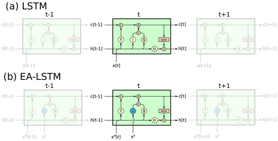 Illustration of the EA-LSTM relative to the standard LSTM [43]. (a) shows the standard LSTM cell, where the input vector is passed into the three main gates (forget, input, and output) as described in Section 3.3. (b) visualizes the EA-LSTM cell, which separates static inputs (blue circle) from dynamic inputs and processes them accordingly. Adopted from Kratzert et al. [43].