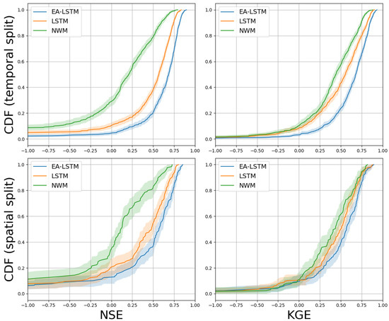 As also shown by the cumulative distribution functions in Figure 3, the LSTM-based models consistently outperform the NWM across both splitting strategies. Under the time-based split, EA-LSTM achieved the highest overall accuracy, with a median NSE of 0.690 and a median Kling–Gupta Efficiency (KGE) of 0.685. The standard LSTM also performed well in this setting, with a median NSE of 0.572 and a median KGE of 0.560. By contrast, the NWM yielded substantially lower skill on the same evaluation set, with a median NSE of 0.210 and a median KGE of 0.443.