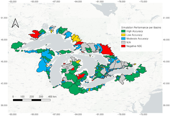 Following the performance classification criteria of Eryani et al. [48] (Table 6), model results for each basin are categorized as high, moderate, low, or negative. Figure 4 shows the spatial distribution of EA-LSTM performance for the time-split experiment across the 632 gauged basins in the Great Lakes region. The model achieved moderate or high accuracy in most basins, indicating strong predictive skill over a large portion of the domain. However, certain basins exhibited low or negative scores, suggesting regions where hydrologic processes are less well-captured by the current model configuration.
