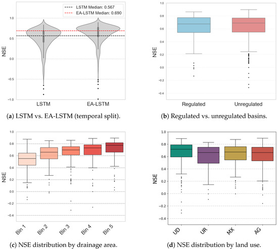 As described by Grenier et al. [49], the dor_pc_pva attribute was used to classify basins as regulated (dor_pc_pva > 100) or unregulated (dor_pc_pva < 100). Under this criterion, the model achieved a median NSE of 0.676 for regulated basins and 0.691 for unregulated basins. The difference in performance between the two groups was minimal, and a Mann–Whitney U test confirmed that it was not statistically significant (p > 0.05; see Appendix A, Table A3 for full details). This suggests that our EA-LSTM model has adequately learned the regulation-related patterns from the data.