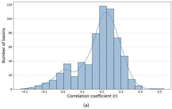 First, to assess the model’s understanding of the fundamental water balance, we evaluated the correlation between a proxy for water availability (daily precipitation minus a temperature-based proxy for evapotranspiration) and the simulated daily discharge (Q). The distribution of Pearson correlation coefficients across all 632 test basins is shown in Figure 6a. The distribution is centered around a physically plausible positive value of approximately +0.2, confirming that the model has learned the correct directional relationship: increased water availability leads to higher streamflow, but with the expected delay and damping characteristic of natural catchments.