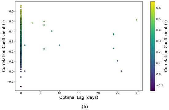 Second, to verify that the model captures snow dynamics, a critical process in many Great Lakes catchments, we analyzed the lagged correlation between snow water equivalent (SWE) and simulated Q for snow-dominated basins. For each basin, we identified the time lag that maximized the SWE–Q correlation. Figure 6b shows that for nearly all snow-dominated basins, the strongest correlation is positive, confirming the model learned the correct physical link between snowpack and runoff. The results also show a range of optimal lags, from rapid responses (lag near 0) to more delayed systems (lags of 5–30 days), demonstrating that the model captures a spectrum of snowmelt processes reflecting the diversity of basin characteristics.