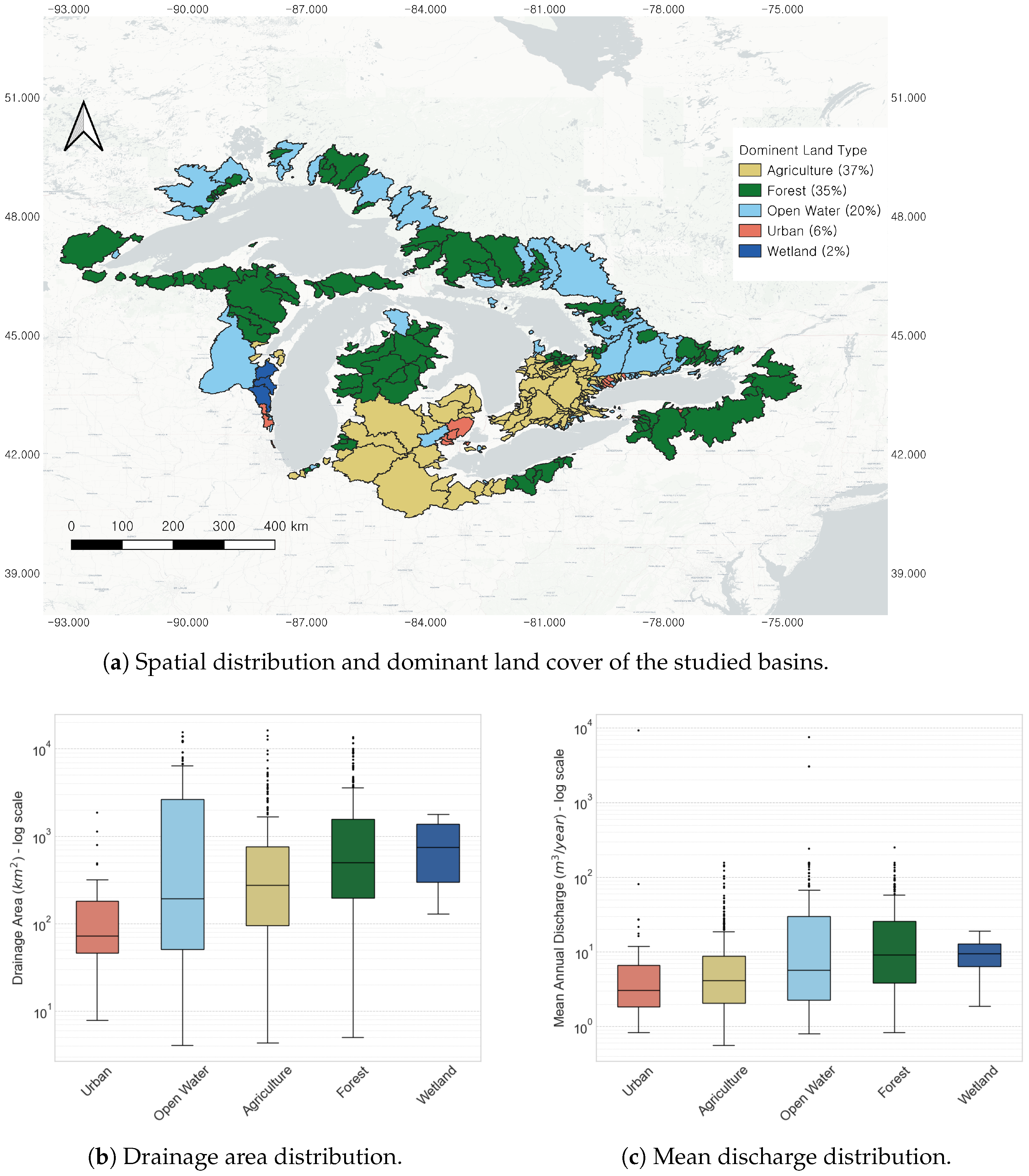 To support our analysis of hydrologic behavior across the Great Lakes basin—a region notable for its bi-national extent spanning both the United States and Canada—we compiled a comprehensive dataset comprising streamflow observations, meteorological forcings, and static catchment attributes. Streamflow data were collected from a total of 975 gauge stations: U.S. gauges were obtained from the United States Geological Survey (USGS), while Canadian gauges were sourced from Environment and Climate Change Canada (ECCC). This dual-sourced dataset provides consistent and coordinated coverage across the international boundary and spans the period from 1 January 1980 to 31 December 2023. For each gauge station, a corresponding sub-basin was delineated, resulting in a total of 975 sub-basins simulated in this study.