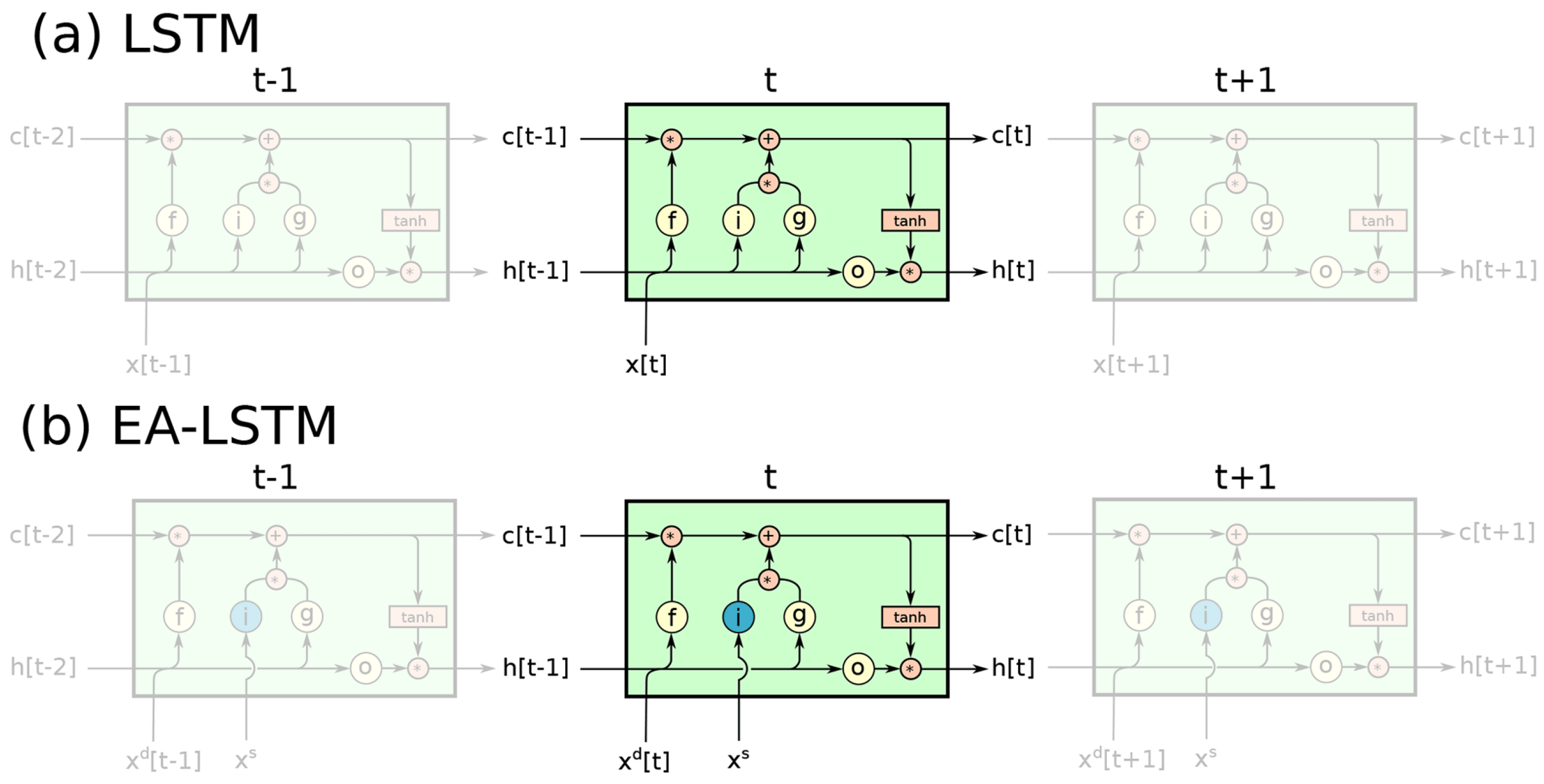 Figure 2). EA-LSTM processes inputs using the same fundamental gating equations as the standard LSTM. However, it distinguishes between static inputs