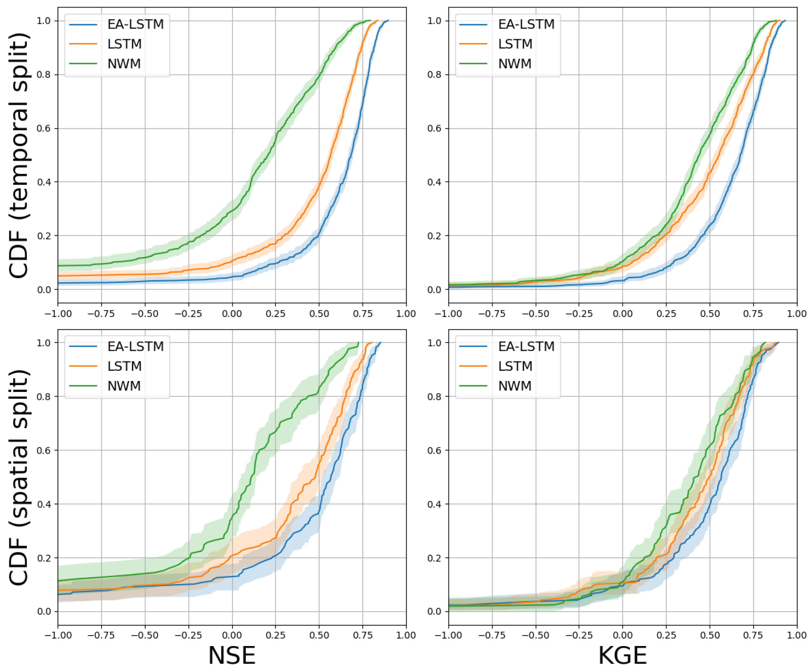 57] argued that when the EA models were tested on catchments unseen during training, the superior performance was primarily driven by meteorological data, while the contribution of static features was limited. This observation is consistent with our finding that the spatial-split EA-LSTM underperforms compared to the temporal-split EA-LSTM. However, the fact that our spatial EA-LSTM performed comparably to the temporal LSTM still supports the utility of EA-LSTM’s dedicated input gate for static attributes [
