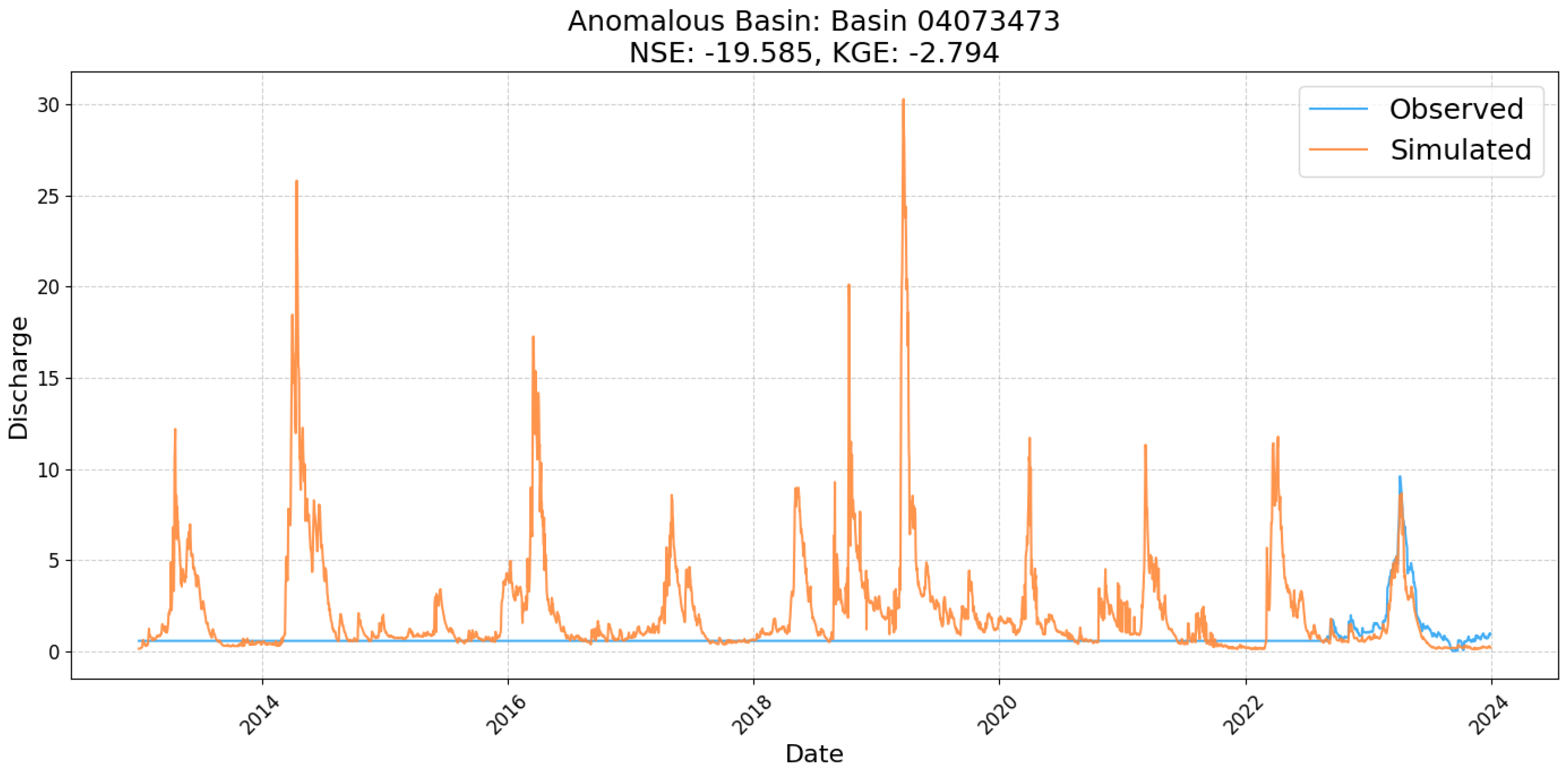 Streamflow gauge observations across a large and complex region like the Great Lakes basin often suffer from missing or inconsistent records. For our streamflow dataset, any dates with missing discharge values were excluded from model training, and basins lacking discharge measurements altogether were omitted from the analysis. To further improve data quality, we implemented anomaly detection and removal procedures at both the point-wise and basin-wise levels.