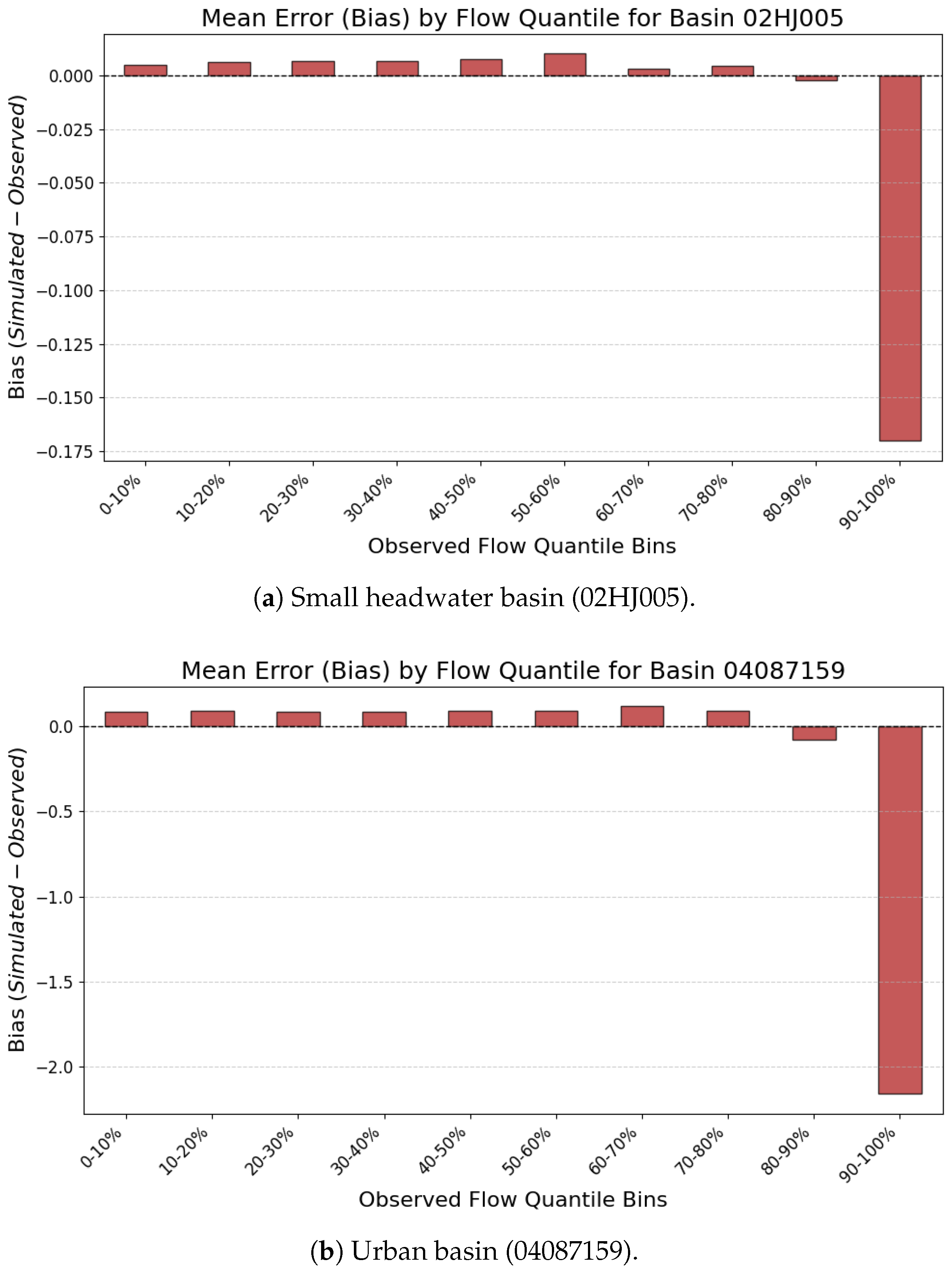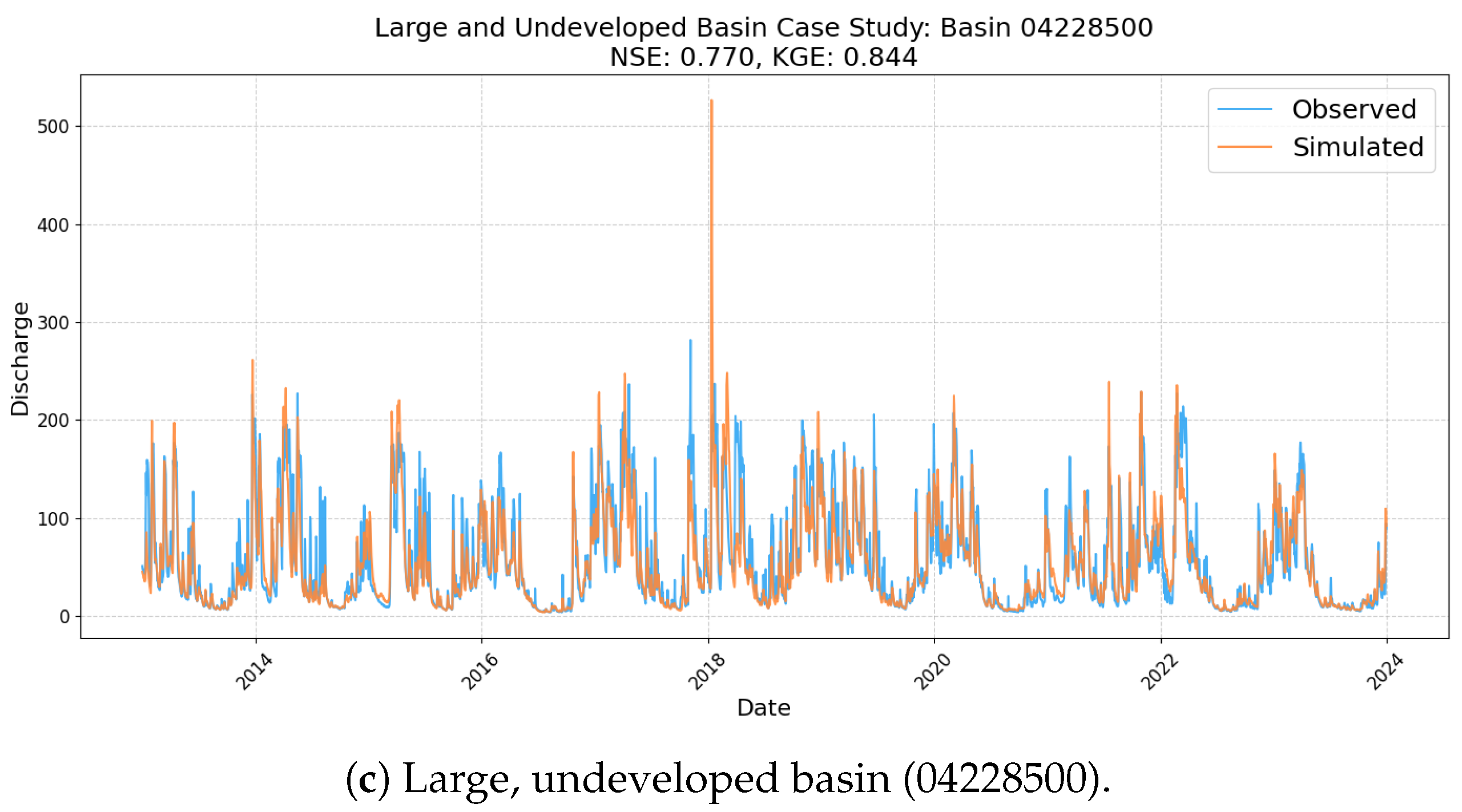 Despite these advances, several limitations remain. Model skill was reduced in small and highly urbanized basins, as well as during extreme events, underscoring challenges in representing rapid local hydrological responses. In addition, benchmark comparisons with process-based models highlight trade-offs between physical interpretability and predictive accuracy that warrant further investigation.