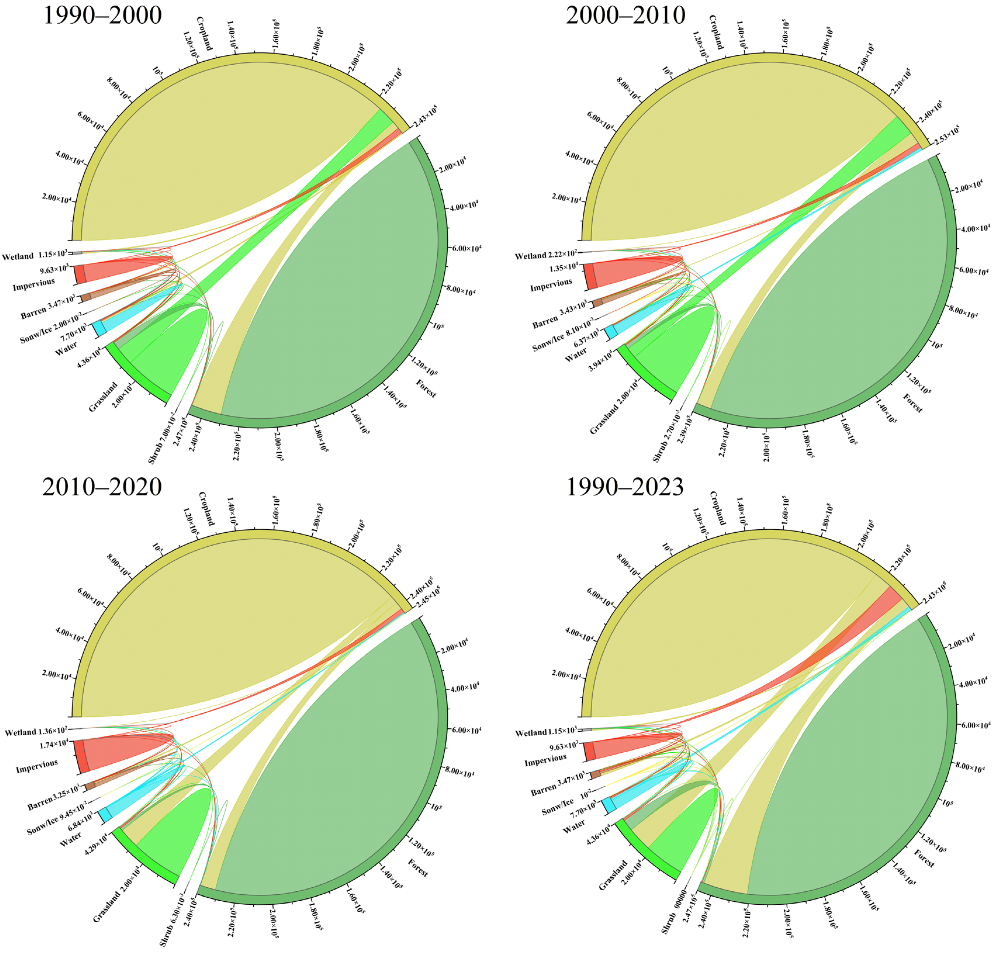 Land Use Type | 1990–2000 | 2000–2010 | 2010–2020 | 1990–2023 | ||||